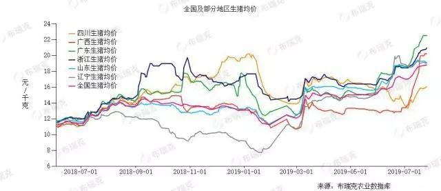 据农业农村部近期发布的数据显示,6、7月份,全国生猪价格持续上涨。六月份,猪肉批发市场均价为每公斤21.59元,环比上涨4.7%,同比上涨29.8%。据农业农村部信息中心和卓创资讯联合监测,2019年第30周(即7月22日-7月26日),16省(直辖市)瘦肉型白条猪肉出厂价格总指数的周平均值为每公斤25.34元,同比上涨43.1%。卓创资讯数据显示,目前猪肉价格已经站上2013年以来的高峰。